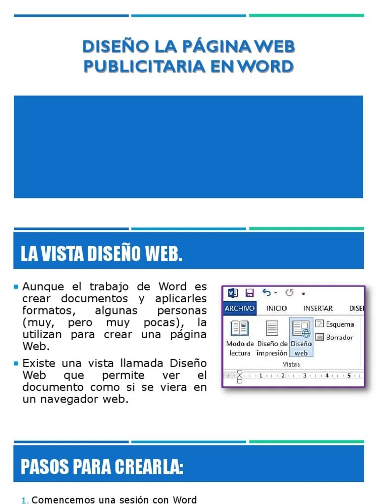 26.01.2012 · 🔥🔥diseño de una página web con microsoft word, puede ser utilizada como presentación tipo web... Con esta herramienta verás, con … 26.01.2012 · 🔥🔥diseño de una página web con microsoft word, puede ser utilizada como presentación tipo web. Si bien es posible crear una página html en este programa, hacer tu propio sitio web es un poco engorroso, no obstante, crear tu website con word es mucho más sencillo de trabajar.. Para que no estés intentando en redactar, luego subir el texto y verificar como ha quedado, podrás ahorrar tiempo en tu trabajo usando la función llamada "diseño web".